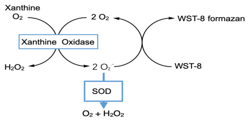 目前測定SOD比較先進(jìn)的方法包括WST-1法和WST-8法,其中WST-8法比WST-1法更加穩定、靈敏度更高。本試劑盒采用了目前測定SOD方法中穩定性更好、靈敏度更高的WST-8法,可以檢測出低達0.5U/ml的超氧化物歧化酶。WST-8法的原理參考圖1,WST-8可以和黃嘌呤氧化酶(Xanthine Oxidase, XO)催化產(chǎn)生的超氧化物陰離子(O2.-)反應產(chǎn)生水溶性的甲臜染料(formazan dye),由于SOD能催化超氧化物陰離子發(fā)生歧化作用,所以該反應步驟可以被SOD所抑制,因此SOD的活性與甲臜染料的生成量成負相關(guān),從而通過(guò)對WST-8產(chǎn)物的比色分析即可計算SOD的酶活力。