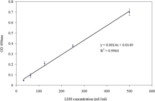 各孔數值減去空白對照后,以檢測的吸光度(OD490)為縱坐標,LDH酶活力(mU)為橫坐標,繪制LDH標準曲線(xiàn)。同時(shí)計算出該趨勢線(xiàn)的公式。