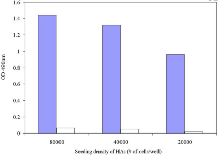 Fig.2 LDH kit is applied to Human Astrocytes(Has) cultured with (Solid bar, Positive control) and without (Open bar, Negative control) Triton X-100