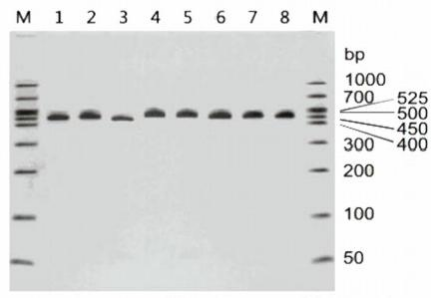 不同種類(lèi)的支原體檢測條帶大小不同,下圖列出了引起細胞污染的8大種類(lèi)常見(jiàn)支原體,若PCR條帶在400bp~600bp范圍內,均可判斷為支原體污染。也可將PCR產(chǎn)物進(jìn)行TA克隆、測序進(jìn)一步鑒定支原體的種類(lèi)。