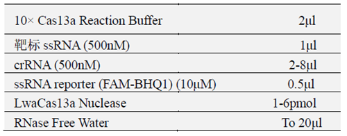 Cas13a核酸酶(又名C2c2)是VI型CRISPR-Cas系統效應蛋白,具有RNA介導的RNA內切酶活性。在靶標單鏈RNA存在PFS序列的情況下,可特異性地切割靶標RNA。此外,Cas13a還具有依賴(lài)于靶標單鏈RNA的反式切割活性(即旁路切割活性),可用于開(kāi)發(fā)靶標核酸的快速檢測試劑盒。
