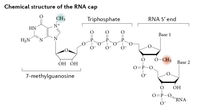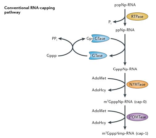 圖1. mRNA 帽結構 2′ -O-甲基轉移酶作用機理。mRNA 的帽結構是由一個(gè)7-甲基鳥(niǎo)苷通過(guò)一個(gè)5′–5′三磷酸酯橋連接到mRNA 鏈的5′核苷上組成。Cap-0 結構由相鄰的 RNA 鏈通過(guò)三種酶的依次反應形成。進(jìn)一步形成 cap-1 結構需要 2′-O-甲基轉移酶的參與,該修飾可以降低 RNA 在體內引起的細胞先天免疫反應。本圖引自Decroly, E., Ferron, F., Lescar, J. et al. (2012). Conventional and unconventional mechanisms for capping viral mRNA. Nat Rev Microbiol 10, 51–65.
