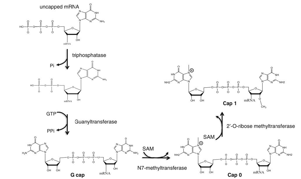 圖1. 參與mRNA 加帽的酶促途徑。Cap 0 結構 RNA 的產(chǎn)生需要牛痘病毒加帽酶:該酶兼具三磷酸酶、鳥(niǎo)苷轉移酶和鳥(niǎo)嘌呤甲基轉移酶的功能。其中S-腺苷甲硫氨酸(SAM)是甲基供體。一旦產(chǎn)生了Cap 0 結構,就可以通過(guò)2'-O-核糖甲基轉移酶進(jìn)一步修飾以產(chǎn)生Cap 1 結構。本圖引自Michael Beverly , Amy Dell, Parul Parmar, Leslie Houghton et al (2016). Label-free analysis of mRNA capping efficiency using RNase H probes and LC-MS. Anal Bioanal Chem.