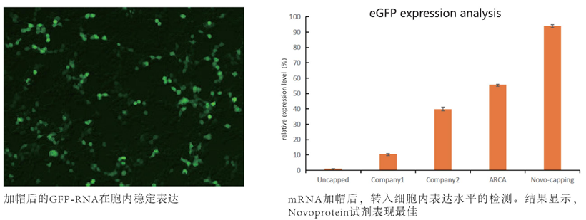 本體系可用于 IVT RNA 的加帽反應,使加帽反應在 1h 之內完成,效率接近 100%,并且保證正確的方向。IVT 推薦使用近岸蛋白質(zhì) T7 High Yield RNA Transcription kit(貨號:E131)。