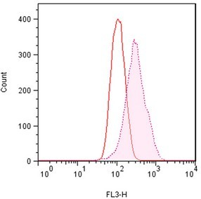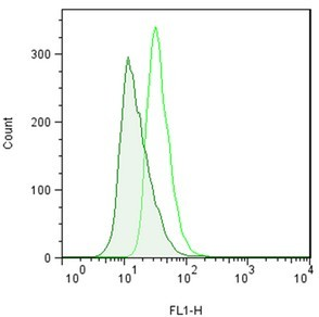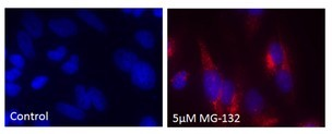 用0.2% DMSO模擬培育Jurkat細胞或在37℃下用5μM的MG-132過(guò)夜培育。用熒光素p62 Ab (1:500稀釋原液)培育細胞。清洗細胞后,通過(guò)流式細胞儀在FL1信道使用488nm的激光進(jìn)行分析。在MG132處理的細胞時(shí),熒光素p62 Ab的抗體信號增加約2.5倍。 |