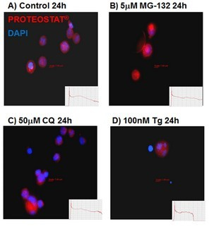 由內質(zhì)網(wǎng)應激的自噬細胞產(chǎn)生的聚集小體和聚集小體類(lèi)的包涵體,epi-熒光顯微成像圖。未經(jīng)處理的K562細胞(A);加入5 mM MG-132溶液培育24小時(shí)(B);加入50 mM CQ培育24小時(shí)(C);加入100 nM毒胡蘿卜素(D)。在溫室下,用PROTEOSTAT? 染料(1:10,000稀釋)來(lái)固定染色細胞30分鐘。PROTEOSTAT? 的著(zhù)色顯示 聚集體 和 ALIS呈紅色, DAPI 呈藍色。(Courtesy of the Flow Cytometry Core Facility, Blizard Institute, Queen Mary University of London, London, UK) |