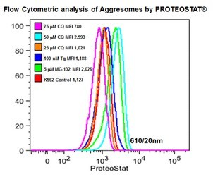 用0.2% DMSO模擬培育Jurkat細胞或在37℃下用5μM的MG-132過(guò)夜培育。然后,用proteostat?染料孵育和固定細胞,不需清洗然后直接通過(guò)流式細胞儀,在FL3信道使用488nm的激光進(jìn)行分析。在MG-132處理的細胞時(shí),紅色熒光信號增加了約3倍。上述的操作會(huì )影響蛋白質(zhì)聚集小體的檢測。 |