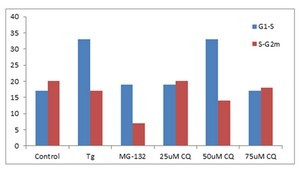 分別使用毒胡蘿卜素(Tg,0.1微米),25,50和75微米氯喹(CQ)處理K562 細胞24小時(shí),來(lái)誘導內質(zhì)網(wǎng)應激和不完全自噬細胞。采用陽(yáng)性對照,加入蛋白酶體抑制劑,鎂 132 (5 μ M)培育 24小時(shí)。固定并透化沉淀的細胞。接著(zhù)根據說(shuō)明書(shū)的指示,在室溫下用 300 μ l PROTEOSTAT? 聚集小體檢測試劑盒 (Enzo Life Sciences)培育細胞30分鐘,加入1 微克/毫升 DAPI (用來(lái)測定細胞周期)。S值聚集小體小傾向的因子(APF)相對增加,G1和G2m的S值是通過(guò)每次細胞處理后檢測的結果和對照組相比而得出。S期和G1相比,ER 應激誘導劑、Tg和 50 μ M CQ的聚集小體數量呈上升趨勢,同時(shí)顯示蛋白酶體抑制劑,MG-132和50μMCQ下降的聚集小體數量在G2M S期比對照水平更低。Courtesy of the Flow Cytometry Core Facility, Blizard Institute, Queen Mary University of London, London, UK. |