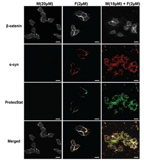 α-syn混合物形式聚集在被內化到M17神經(jīng)母細胞瘤細胞系的細胞質(zhì)膜。用α-syn單體處理M17細胞,聲波處理α-SIGN PFFs或α-SYN混合物(M + F)。四天后,在固定M17細胞前,將其清洗3次,用 PROTEOSTAT?聚合染料(綠色)染色和用抗α-syn(紅)和β連環(huán)蛋白(灰色)免疫染色。比例尺= 20μm。作者提到“Fibril生長(cháng)和播種量α-synuclein蛋白介導的細胞凋亡中發(fā)揮重要作用?!贝藞D來(lái)自A-L Mahul-Mellier, et al.; Cell Death & Differentiation (2015). (doi:10.1038/cdd.2015.79). |