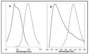 ![]() 在PROTEOSTAT?聚集小體檢測試劑(A)和Hoechst 33342核染色(B)的激發(fā)和發(fā)射光譜。