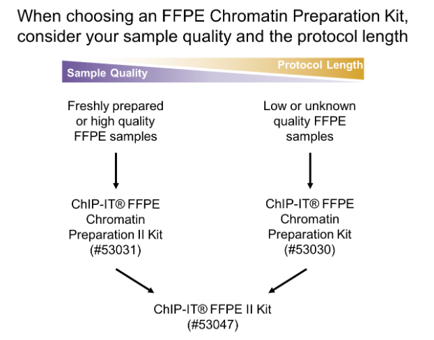 福爾馬林固定石蠟包埋(FFPE)臨床樣本是回顧性研究的寶貴資源。然而,處理FFPE樣本對ChIP等表觀(guān)遺傳學(xué)技術(shù)提出了挑戰。Active Motif利用其表觀(guān)遺傳學(xué)專(zhuān)業(yè)知識開(kāi)發(fā)了市上可用的試劑盒,使FFPE組織的ChIP用于下一代測序(ChIP- seq)。FFPE ChIP檢測有兩個(gè)模塊,染色質(zhì)制備試劑盒(根據樣品質(zhì)量有兩種選擇)和ChIP- it?FFPE II試劑盒(用于進(jìn)行基于ChIP的富集),以允許根據起始材料的類(lèi)型和數量靈活使用。