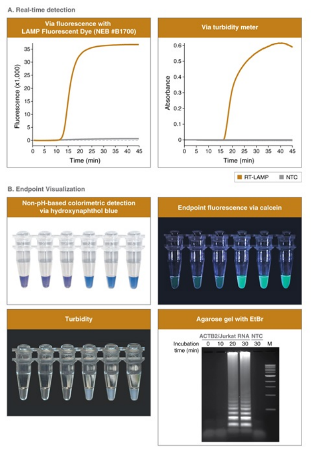 使用 WarmStart 通用 LAMP/RT-LAMP 2X 預混液(含 UDG)(NEB #M1708)對 RNA 或 DNA 樣品擴增,可通過(guò)多種實(shí)時(shí)(A)和終點(diǎn)(B)檢測方法進(jìn)行結果判定。這些檢測方式包括熒光法、不基于 pH 的變色法(例如:羥基萘酚藍)、濁度法或瓊脂糖凝膠電泳。對于實(shí)時(shí)熒光檢測,可使用包含 50X LAMP 熒光染料的試劑盒(NEB #E1708),在常規實(shí)時(shí) PCR 儀器的 SYBR?/FAM 通道中進(jìn)行監測。