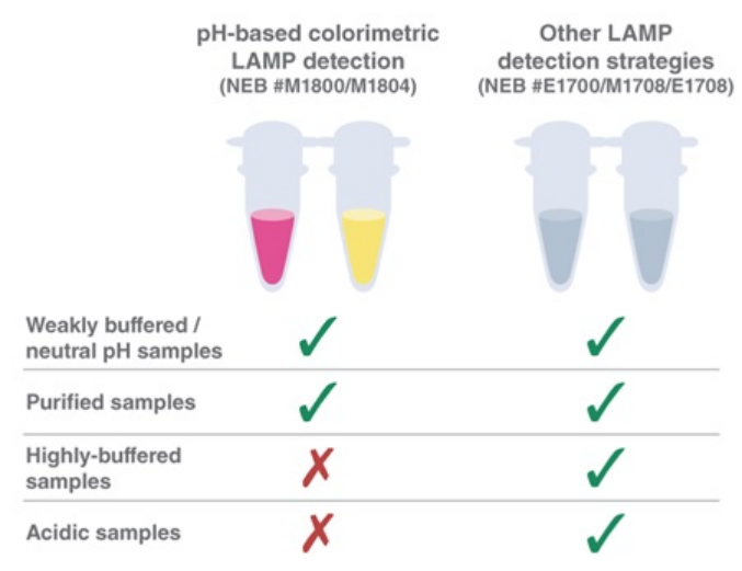 NEB 基于 pH 變化的 WarmStart 變色LAMP/RT-LAMP 2X 預混液(含/不含 UDG)(NEB #M1804)(NEB# M1800)緩沖力低,因此可使用 pH 敏感染料進(jìn)行可視化擴增檢測?;?pH 值改變而產(chǎn)生的顏色變化(如粉紅變黃色)所需緩沖力要低,高緩沖力樣品或酸性樣品可能會(huì )影響顏色變化,因此,這種方法限制了檢測樣品的種類(lèi)。WarmStart 通用 LAMP/RT-LAMP 2X 預混液(含/不含 UDG)(NEB #M1708,NEB #E1708)(NEB #E1700)是完全緩沖的,可檢測所有樣品類(lèi)型,適用于多種檢測方法,包括熒光或其它變色染料(例如:羥基萘酚藍)