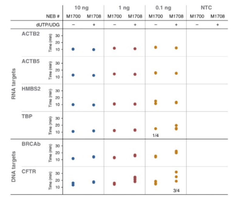 使用 WarmStart 熒光 LAMP/RT-LAMP 2X 預混液(不含 dUTP/UDG)(NEB #M1700 試劑盒中的組分)和 WarmStart 通用 LAMP/RT-LAMP 2X 預混液(含 UDG)(NEB #M1708)進(jìn)行 RT-LAMP(RNA 靶標)或 LAMP(DNA 靶標)實(shí)驗。反應加入 1X LAMP 引物和 1X LAMP 熒光染料后,分別加入三個(gè)數量級的 Jurkat RNA 或 Jurkat DNA (10 ng-0.1 ng)和無(wú)模板對照(NTC),每個(gè)樣品做 4 個(gè)重復,形成 25 μl 反應體系,置于 96 孔板中 65℃孵育 40 分鐘。使用實(shí)時(shí)熱循環(huán)儀(Bio-Rad? CFX96)中的 SYBR/FAM 通道進(jìn)行 15 秒一次的熒光檢測。每個(gè)點(diǎn)代表熒光信號超過(guò)儀器閾值的時(shí)間。除了個(gè)別說(shuō)明外,每個(gè)樣品都檢測到所有 4 個(gè)重復(注:如果各重復的檢測時(shí)間相似,則檢測點(diǎn)重疊)??傮w而言,各樣品檢測結果顯示:NEB #M1700 和 NEB #M1708 性能一致。無(wú)模板對照均無(wú)擴增。