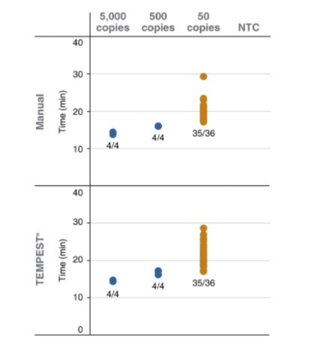 通過(guò)手動(dòng)或 TEMPEST? 自動(dòng)化液體處理工作站(96 孔,25 μl 反應)建立針對于合成 SARS-CoV-2 RNA 樣品的 LAMP 檢測體系。檢測樣品為:陽(yáng)性樣品(人總 RNA 混入 5,000、500 或 50 拷貝的合成 SARS-CoV-2 RNA)或無(wú)模板對照(NTCs)。經(jīng) 65℃ 孵育 40 分鐘,使用 1X LAMP 熒光染料在實(shí)時(shí)熒光儀器(Bio-Rad CFX96)中的 SYBR/FAM 通道檢測。結果顯示:兩種體系的檢測時(shí)間和最低檢出限(LOD)結果一致。