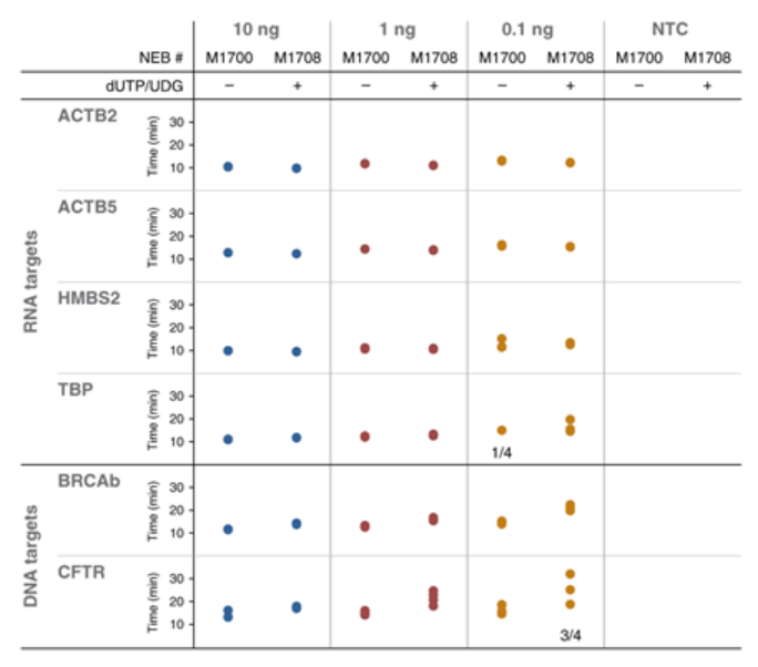 使用 WarmStart 熒光 LAMP/RT-LAMP 2X 預混液(不含 dUTP/UDG)(NEB #M1700 試劑盒中的組分)和 WarmStart 通用 LAMP/RT-LAMP 2X 預混液(含 UDG)(NEB #M1708)進(jìn)行 RT-LAMP(RNA 靶標)或 LAMP(DNA 靶標)實(shí)驗。反應加入 1X LAMP 引物和 1X LAMP 熒光染料后,分別加入三個(gè)數量級的 Jurkat RNA 或 Jurkat DNA (10 ng-0.1 ng)和無(wú)模板對照(NTC),每個(gè)樣品做 4 個(gè)重復,形成 25 μl 反應體系,置于 96 孔板中 65℃孵育 40 分鐘。使用實(shí)時(shí)熱循環(huán)儀(Bio-Rad? CFX96)中的 SYBR/FAM 通道進(jìn)行 15 秒一次的熒光檢測。每個(gè)點(diǎn)代表熒光信號超過(guò)儀器閾值的時(shí)間。除了個(gè)別說(shuō)明外,每個(gè)樣品都檢測到所有 4 個(gè)重復(注:如果各重復的檢測時(shí)間相似,則檢測點(diǎn)重疊)??傮w而言,各樣品檢測結果顯示:NEB #M1700 和 NEB #M1708 性能一致。無(wú)模板對照均無(wú)擴增。