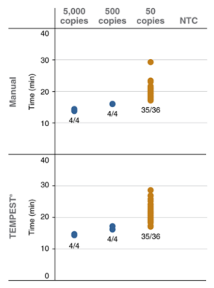 通過(guò)手動(dòng)或 TEMPEST? 自動(dòng)化液體處理工作站(96 孔,25 μl 反應)建立針對于合成 SARS-CoV-2 RNA 樣品的 LAMP 檢測體系。檢測樣品為:陽(yáng)性樣品(人總 RNA 混入 5,000、500 或 50 拷貝的合成 SARS-CoV-2 RNA)或無(wú)模板對照(NTCs)。經(jīng) 65℃ 孵育 40 分鐘,使用 1X LAMP 熒光染料在實(shí)時(shí)熒光儀器(Bio-Rad CFX96)中的 SYBR/FAM 通道檢測。結果顯示:兩種體系的檢測時(shí)間和最低檢出限(LOD)結果一致。