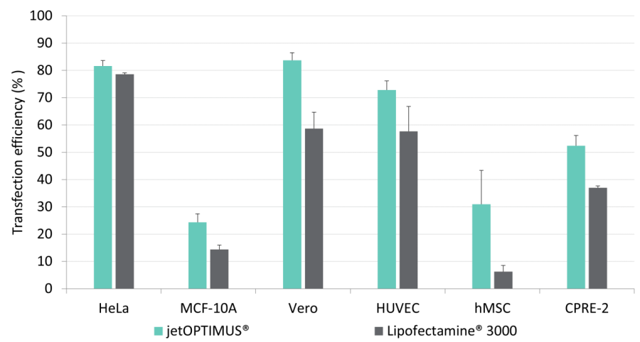 圖1: jetOPTIMUS?勝過(guò)其主要競爭對手。在24孔板中用編碼GFP蛋白的質(zhì)粒轉染后24小時(shí),通過(guò)FACS分析在各種細胞系中評估轉染效率。根據制造商的建議為L(cháng)ipofectamine?3000和jetOPTIMUS?.