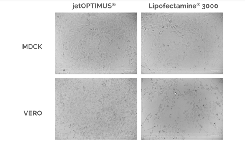 圖2:轉染后24小時(shí),細胞保持健康并保持良好的形態(tài)。在用編碼GFP蛋白的質(zhì)粒轉染后24小時(shí),根據制造商對每種試劑的建議,對MDCK和VERO細胞進(jìn)行相差顯微鏡檢查。