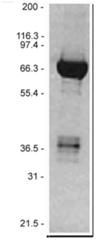 Figure 1. MCAK Motor Domain protein gel. A 10 μg sample of MCAK Motor Domain protein (GST-tagged) was separated on a 4-20% SDSPAGE gradient gel, along with Mark12 molecular weight markers (Invitrogen). The fusion protein runs at 70 kD on the polyacrylamide gradient gel. Protein quantitation was determined using Advanced Protein assay (Cat.# ADV01)