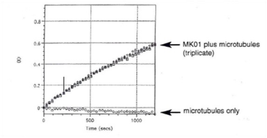 Protein purity is estimated by scanning densitometry of a coomassie-stained SDS-PAGE gradient gel. Figure 1 shows 10 μg of MK01 protein and purity was determined to be >80%. The total protein in each tube will therefore be approximately 20% greater than the amount shown on the tube. The major contaminant at approximately 30 kD is GST protein. The microtubuleactivated ATPase activity of the MCAK motor is not inhibited by this contaminant.
