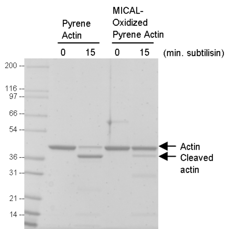 Pyrene labeled actin (Cat. # AP05) and MICAL-oxidized (pyrene labeled) actin (Cat. # MXAP95) was diluted to 0.1 mg/ml (2.3 μM). 2 μg of each sample was then left untreated, or treated with subtilisin (1:200 w/w) for 15 min. Samples were then separated by SDS-PAGE and visualized with Coomassie staining.