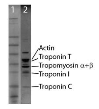 Legend: A 20 μg sample of CTFC proteins was separated by electrophoresis in a 4-20% SDS-PAGE system (Lane 2) and stained with Coomassie Blue. Molecular weights are 43 kDa actin,38 kDa Troponin T, 32 kDa Tropomyosin (α+β)), 24 kDa Troponin I, and 18 kDa Troponin C. Protein concentration was measured with the Precision Red? Protein Assay Reagent (Cat.# ADV02). See Blue molecular weight markers (Lane 1) are from Life Technologies Inc.