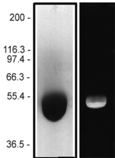 Figure 1: HiLyte Fluor? 488 tubulin protein purity determination. A 50 μg sample of unlabeled tubulin protein was separated by electrophoresis in a 4-20% SDS-PAGE system and stained with Coomassie Blue (A). Protein quantitation was performed using the Precision Red Protein Assay Reagent (Cat. # ADV02). 20 μg of the same protein sample was run in a 4-20% SDS-PAGE system and photographed directly under UV illumination (B).