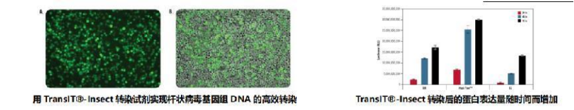 ·TransIT?-Insect Transfection Reagent 昆蟲(chóng)細胞專(zhuān)用轉染試劑,用于制備高滴度桿狀病毒瞬時(shí)轉染和重組桿狀病毒制備是昆蟲(chóng)細胞表達常用方法,TransIT?-Insect 是一款專(zhuān)用于多種昆蟲(chóng)細胞系的高效 DNA 轉染試劑。