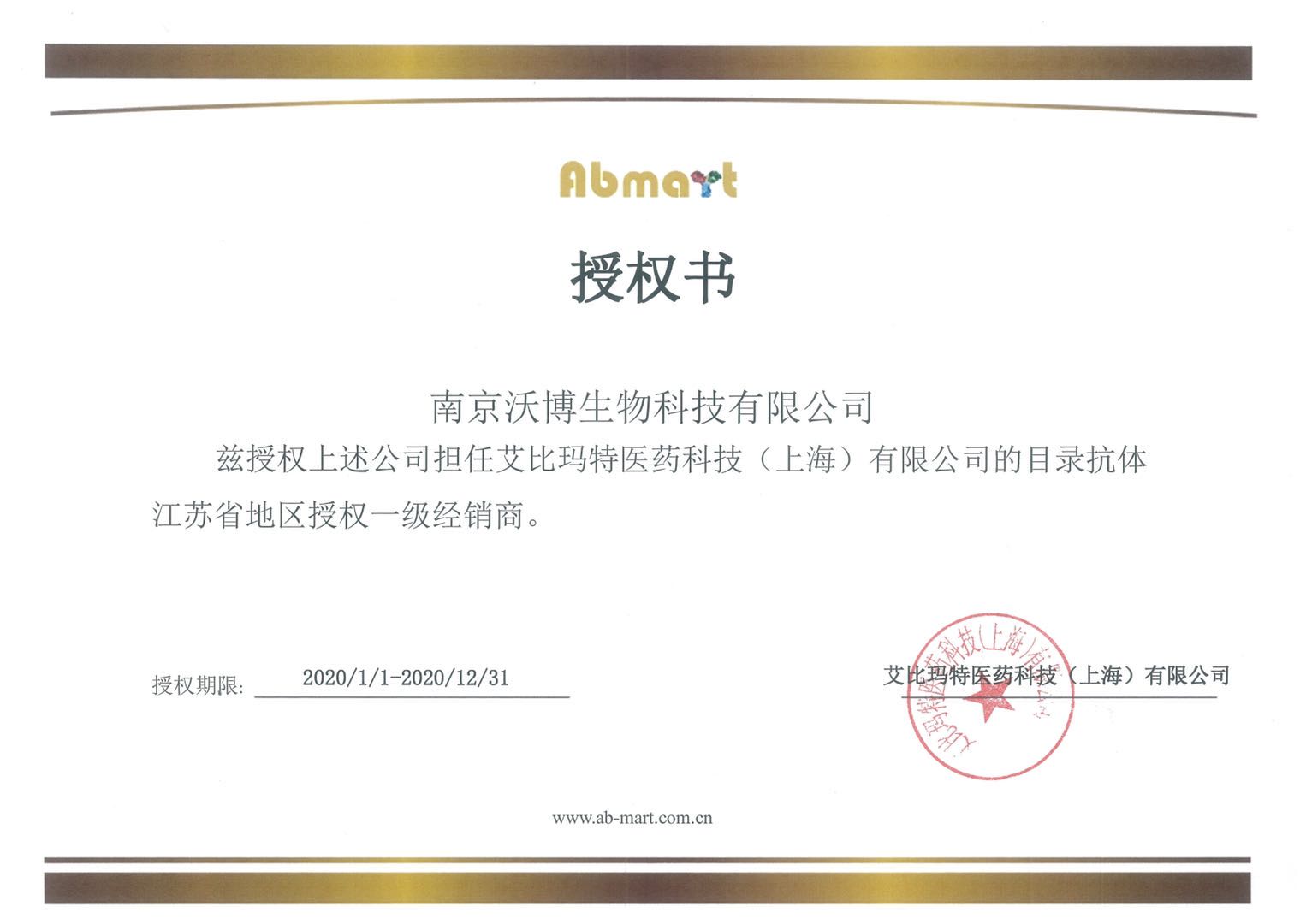 熱烈慶祝南京沃博生物成為Abmart艾比瑪特醫藥科技(上海)有限公司2020年度江蘇省授權代理商