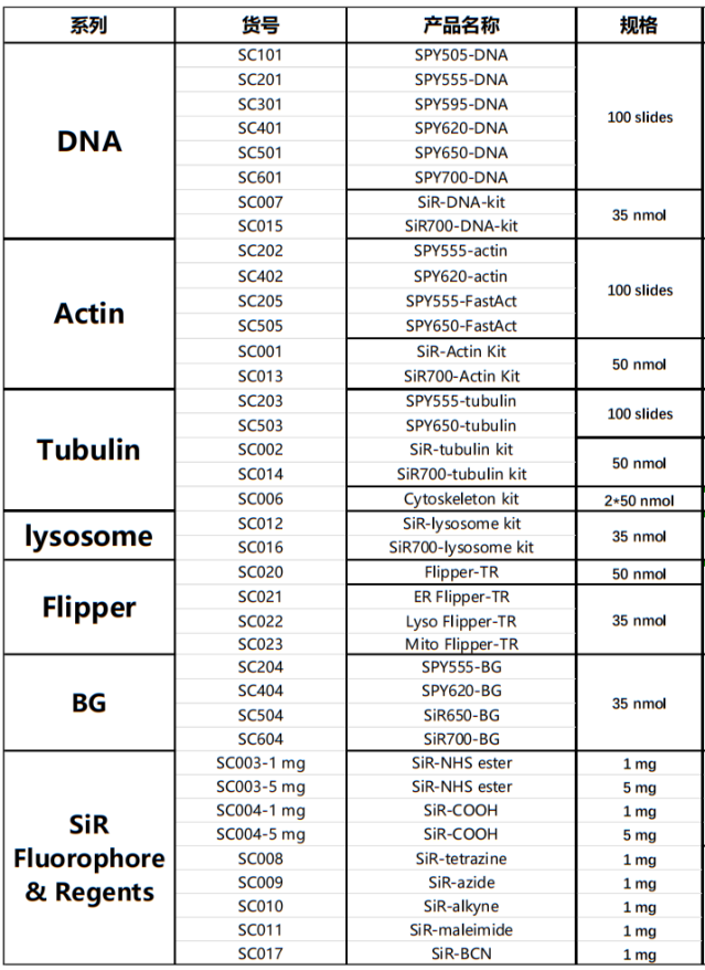 Spirochrome公司開(kāi)發(fā)的活細胞成像探針是可滲透細胞的化合物,可染色活細胞中的微管(SiR-Tubulin)、F-actin (SiR-Actin)、溶酶體(SiR-Lysosome)和染色體DNA (SiRDNA)。還可提供:下一代活細胞SPYTM探針,膜張力FLIPPER TR探針,以及spirochrometm的bg-substrate。