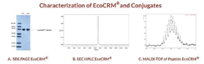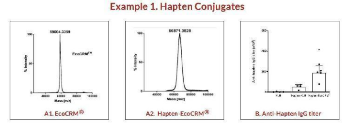 A. MALDI-TOF 法表征載體蛋白和結合物。與半抗原偶聯(lián)前 (A1) 和偶聯(lián)后 (A2) 分析 EcoCRM? 載體蛋白。使用在高質(zhì)量線(xiàn)性模式下操作的 Applied Biosystems/MDS SCIEX 54800 MALDI TOF/TOF 分析儀分析樣品。