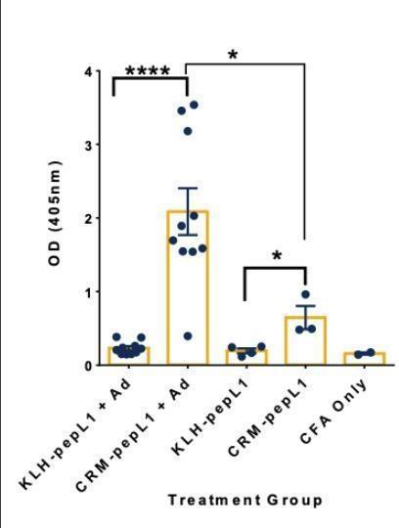 肽 PepL1 與 FinaBio 的即用型結合物 CRM-馬來(lái)酰亞胺或 KLH(由肽合成公司)結合。即用型結合物 CRM-馬來(lái)酰亞胺極大地促進(jìn)了 EcoCRM 結合物的合成。如圖所示,與 KLH 結合物相比,CRM 結合物產(chǎn)生了極好的抗肽抗體應答。小鼠在接種疫苗后產(chǎn)生免疫反應,并用靶向伯克霍爾德菌表面 OMP 的肽-蛋白 +/-佐劑增強免疫反應。AddaVax 佐劑 (~MF59)。FinaBio 的 Ready-to-conjugate CRM 對結合物的響應顯著(zhù)高于 KLH。還應注意,即使不存在佐劑,CRM 結合物也具有免疫原性。