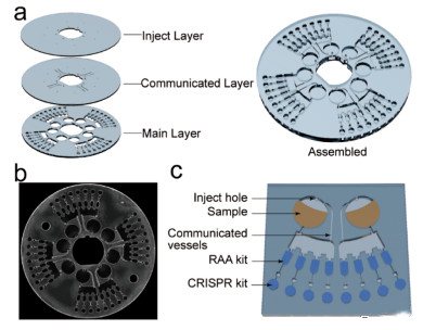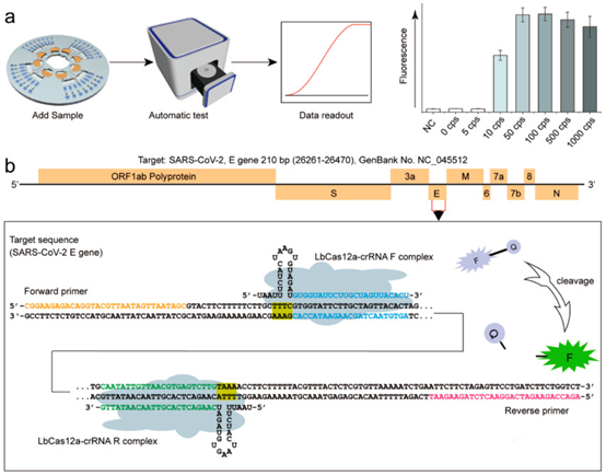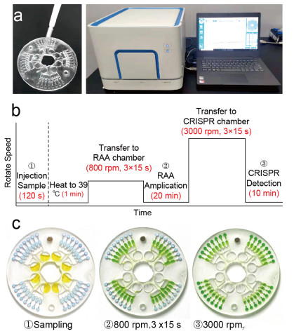 圖1 CRISPR/Cas12a輔助的RT-RAA的超敏檢測SARS-CoV-2的自動(dòng)化離心微流控平臺