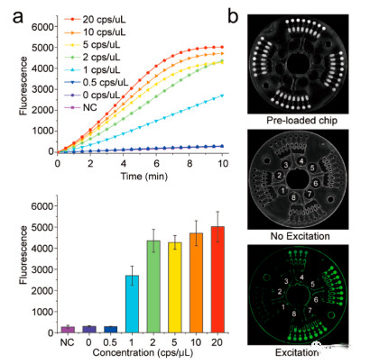圖5 基于雙CRISPR/Cas12a輔助RT-RAA的自動(dòng)微流控平臺上檢測SARS-CoV-2