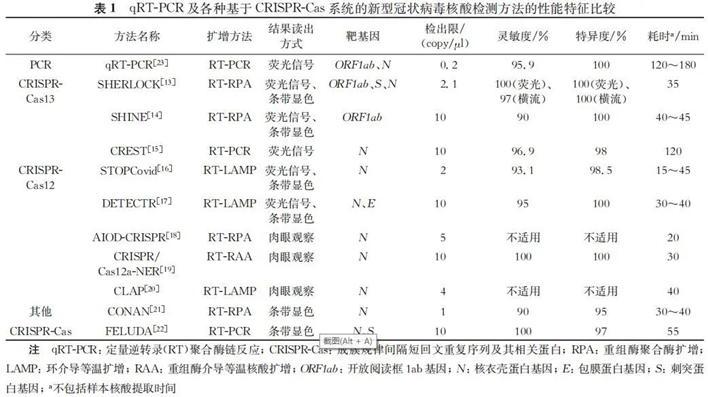 Cas9、Cas3等其他CRISPR-Cas系統雖然沒(méi)有反式切割活性,無(wú)法實(shí)現游離報道分子的信號放大,但利用其靶向結合的活性同樣可以準確檢測出SARS-CoV-2的RNA序列?;?span>Cas3操作的核酸檢測方法 (Cas3-operated nucleic acid detection,CONAN) ,最快能在40 min內檢測出單拷貝SARS-CoV-2 RNA。Azhar等首次開(kāi)發(fā)出一種基于CRISPR-Cas9系統檢測SARS-CoV-2的方法FELUDA (FnCas9 editor linked uniform detection assay) ,試劑盒已獲準在印度上市銷(xiāo)售。該法無(wú)需對報告分子進(jìn)行反式切割,直接利用Cas9的酶切作用進(jìn)行核酸檢測,準確度與qRT-PCR檢測相似,并且在檢測致病性單核苷酸變異和核酸序列分析方面準確度也很高。表1列出了qRT-PCR以及各種基于CRISPR-Cas系統的SARS-CoV-2核酸檢測方法的性能特征。