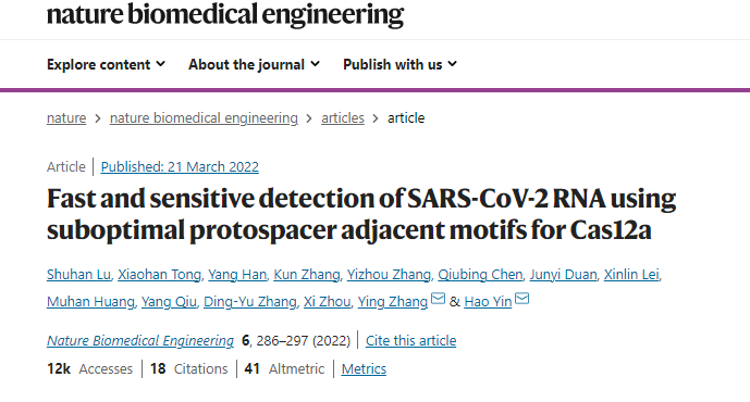 武漢大學(xué)醫學(xué)研究院/教育部免疫與代謝前沿科學(xué)中心的殷昊教授和張楹教授課題組,在《Nature Biomedical Engineering》期刊上發(fā)表題為“Fast and sensitive detection of SARS-CoV-2 RNA using suboptimal protospacer adjacent motifs for Cas12a”的文章,影響因子29.234。