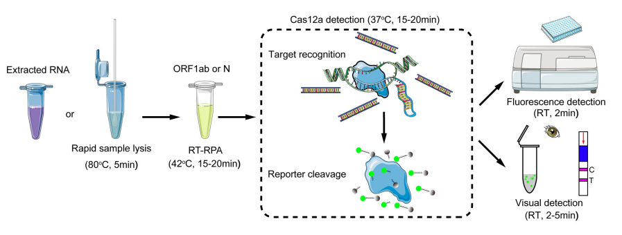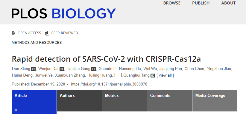 亞能生物湯光輝博士的課題組在《PLOS Biology》期刊上發(fā)表了題為“Rapid detection of SARS-CoV-2 with CRISPR-Cas12a.”的文章,影響因子9.593。文中介紹了一種基于CRISPR Cas12a的檢測SARS-CoV-2的方法。