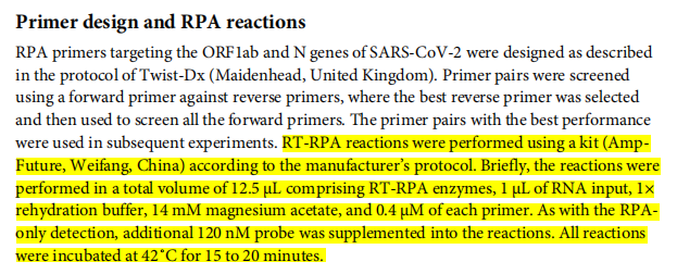 實(shí)驗采用兩步法的操作方法,首先使用安普未來(lái)試劑在42?C的條件下擴增15-20分鐘,再使用CRISPR Cas12蛋白在37?C條件下反應15-20分鐘。該實(shí)驗最快可以在35分鐘內完成,并在紫外光成像儀或橫向流動(dòng)帶下進(jìn)行可視化的結果判讀。