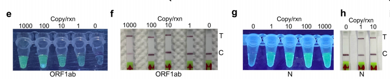 該實(shí)驗的分析靈敏度為1拷貝/μL,即達到1拷貝/反應,且可以通過(guò)肉眼觀(guān)察結果。這種準確、便攜、快速的檢測方法在非專(zhuān)業(yè)分子實(shí)驗室環(huán)境中對檢測COVID-19方面具有巨大的市場(chǎng)前景及發(fā)展潛力。