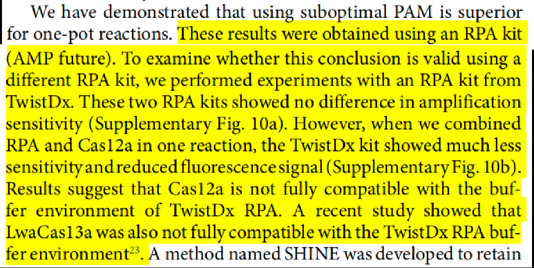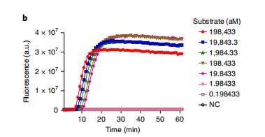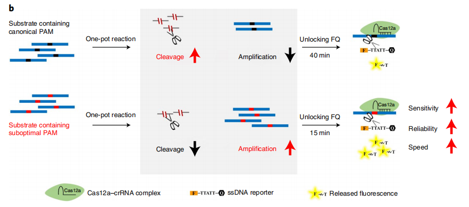 該實(shí)驗將MIRA與CRISPR結合,提供了一個(gè)可視化檢測方法,且反應溫度為37-42°C,控溫要求低,節省了昂貴儀器的成本,大大提高現場(chǎng)檢測的可能性。
