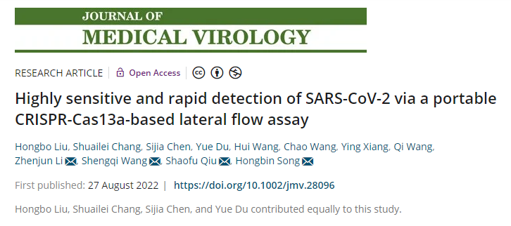 中國人民解放軍疾病預防控制中心宋宏彬主任的課題組在《JOURNAL OF MEDICAL VIROLOGY》發(fā)表了題為“Highly sensitive and rapid detection of SARS-CoV-2 via a portable CRISPR-Cas13a-based lateral flow assay”的文章,影響因子20.693。
