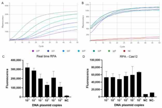 圖1. 實(shí)時(shí) RPA 和 RPA-Cas12a 檢測系統的靈敏度