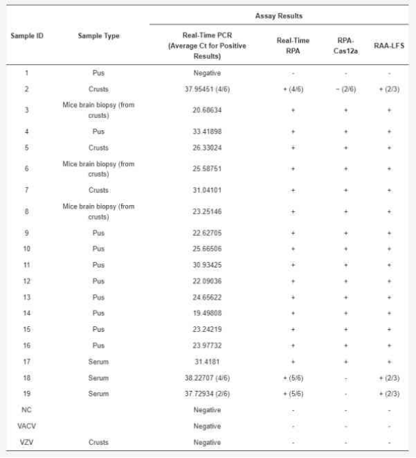 本研究中所報道的檢測方法是基于重組聚合酶對病毒基因組的目標區域進(jìn)行等溫擴增,并分別與CRISPR/Cas12、核酸外切酶以及橫向流動(dòng)試紙條相結合而開(kāi)發(fā)的。研究人員使用三種檢測方法對19份提取自中非臨床樣本的DNA進(jìn)行檢測驗證,檢測結果與傳統檢測定量PCR的結果一致。