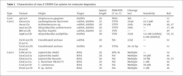 之后大家繼續思考,既然crRNA可以引導Cas蛋白特異性識別靶序列,那CRISPR技術(shù)是否也可以應用于核酸檢測中?答案是肯定的。隨著(zhù)對CRISPR/Cas系統研究的不斷深入,Cas蛋白的特點(diǎn)及功能活性被逐漸認識并應用,并且發(fā)現了更多的Cas蛋白,Cas12a、Cas13a等被定義并命名。表1中列出用于分子診斷的CRISPR/Cas系統及其特點(diǎn)。其中可以看到,Cas12a主要靶向單鏈或雙鏈DNA,而Cas13a可以直接靶向RNA。