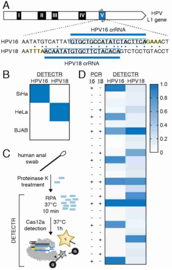 2018年,Chen等研究發(fā)現當CRISPR/Cas12a蛋白以序列特異性的方式切割dsDNA時(shí),會(huì )誘發(fā)強烈的、非特異性ssDNA 的反式切割。作者利用Cas12a 這一附屬切割活性開(kāi)發(fā)了一種準確快速的檢測方法。該檢測方法將Cas12a 與等溫擴增相結合,命名為DETECTR (DNA endonuclease-targeted CRISPR trans reporter),并實(shí)現患者樣品中人乳頭瘤病毒(HPV)高靈敏檢測。