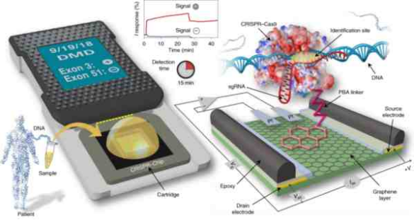 Hajian等在2019年開(kāi)發(fā)一種CRISPR芯片,該芯片材質(zhì)基底為石墨烯,利用場(chǎng)效應晶體管與CRISPR/Cas系統結合來(lái)檢測是否有目標序列的存在。石墨烯芯片上預制許多CRISPR/dCas9分子復合物。其中dRNP復合體可以解旋雙螺旋DNA,并且掃描整條DNA鏈,如果發(fā)現目標序列,dRNP復合體就可以調控場(chǎng)效應晶體管來(lái)輸出電信號完成檢測。但是整個(gè)芯片的檢測成本較高。相關(guān)示意圖見(jiàn)圖4.
