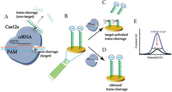 2019年,Dai等通過(guò)探索Cas12a(cpf1)的反式剪切活性,想要開(kāi)發(fā)一種通用的電化學(xué)傳感器。如圖5所示,Cas12a既有crRNA介導的特異性的順式剪切(cis-cleavage),也有非特異性的反式剪切活性(trans-cleavage)。圖5B中結合有亞甲基藍燃料的非特異的單鏈DNA報告分子被固定在金電極上。如果存在目標分子,Cas12a-crRNA就會(huì )介導對非特異ssDNA報告分子的反式剪切,產(chǎn)生較低的電化學(xué)信號;而如果沒(méi)有目標分子存在,Cas12a-crRNA不會(huì )激活其反式剪切活性,報告分子不會(huì )被切割,就會(huì )產(chǎn)生比較高的電化學(xué)信號,以此來(lái)判斷是否存在目標序列。