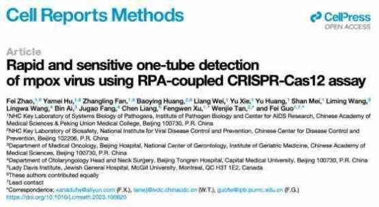 2023年10月16日,中國醫學(xué)科學(xué)院病原生物學(xué)研究所郭斐課題組在 Cell Reports Methods 期刊發(fā)表了題為:Rapid and sensitive one-tube detection of mpox virus using RPA-coupled CRISPR-Cas12 assay 的研究論文。