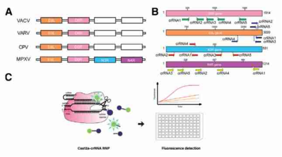 研究團隊首先設計了兩個(gè)crRNA的檢測體系池,其中一組靶向正痘病毒(包括痘苗病毒、天花、牛痘以及猴痘)的保守區D6R和E9L,可以檢測所有的正痘病毒;另外一組靶向猴痘病毒特有的區域N3R和N4R。通過(guò)對crRNA的設計和篩選,建立了基于CRISPR/Cas12a的熒光報告體系(圖1)。